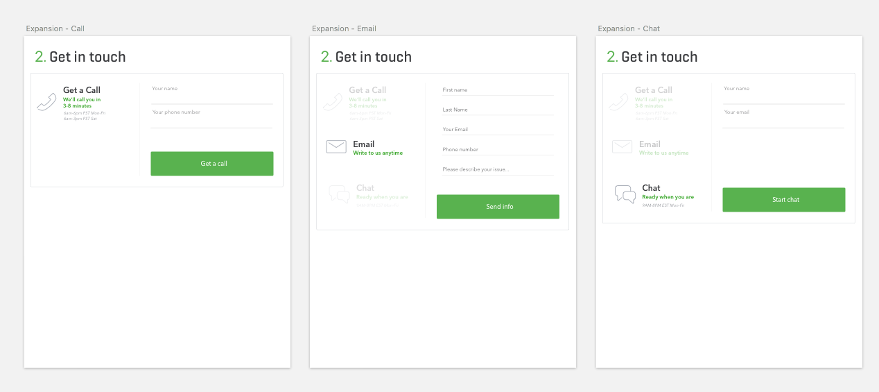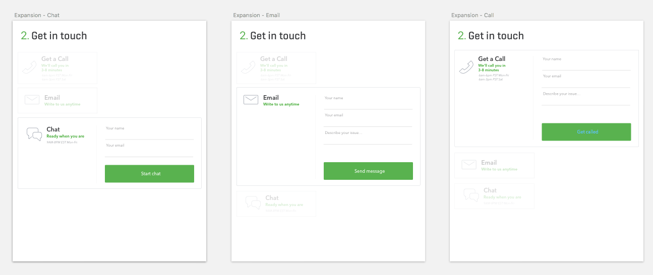 The Contact Us page was the first to go into development. I provided design and interaction specifications at mobile, tablet, and desktop sizes for the developers.
